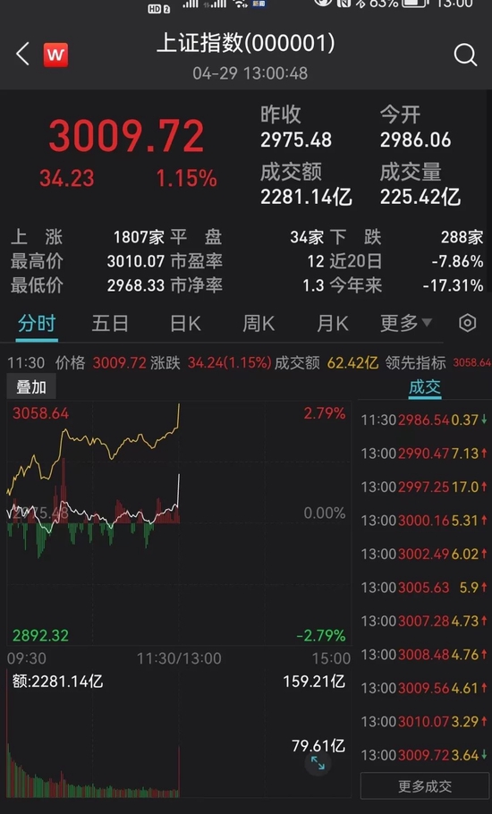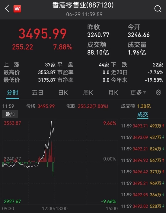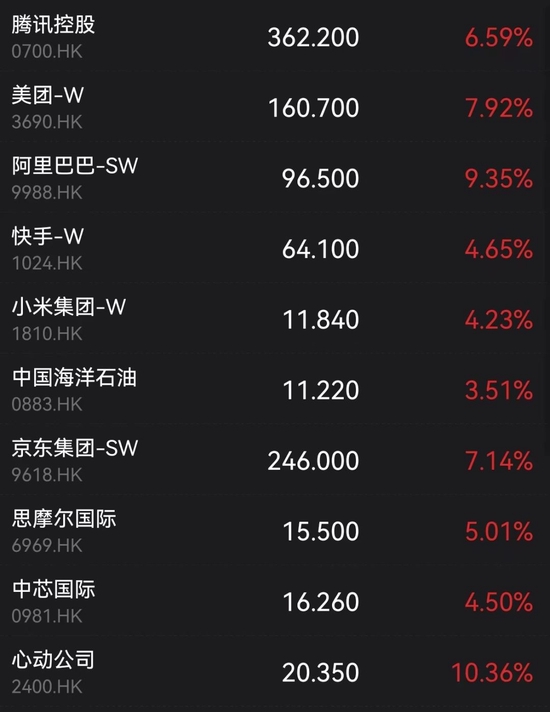 最令人惊喜的是临近午间收盘的港股表现。4月29日早盘尾声时段,恒生科技指数狂拉,涨幅进一步扩大至5%,恒指涨逾2%,其中,互联网科技股领涨,阿里巴巴涨逾9%,领涨蓝筹,京东、美团涨逾8%。