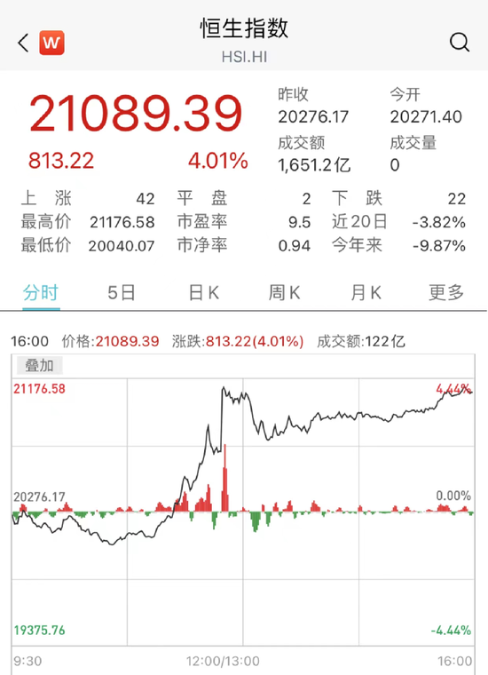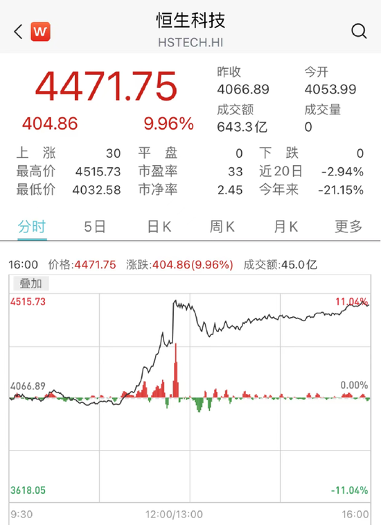 今日,港股集体大幅收涨,香港恒生指数涨4.01%,收复21000点;恒生科技指数涨9.96%。行业板块集体上涨,互联网科技股领涨,阿里巴巴、京东、美团涨超15%,哔哩哔哩涨超12%。教育、家电、博彩、汽车等板块涨幅靠前,理想汽车涨超8%。