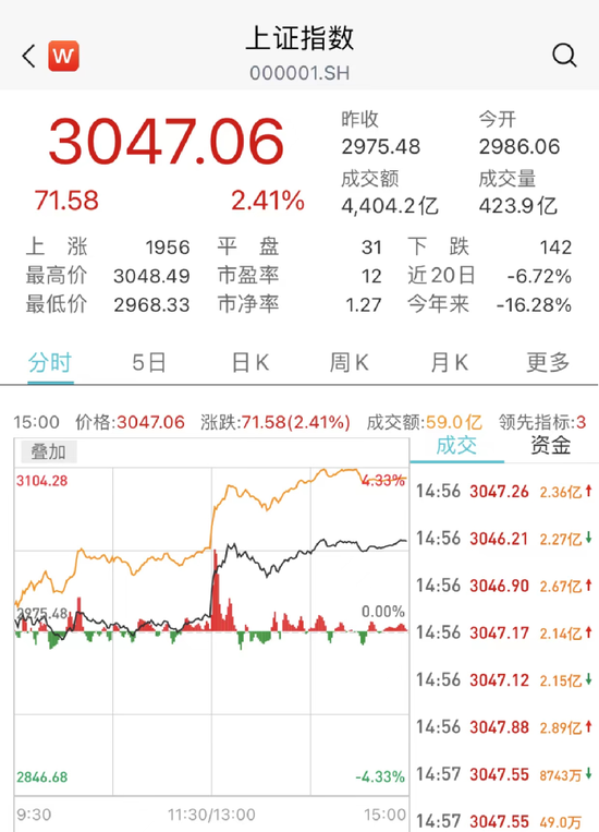 4月29日,截至收盘,上证指数收盘报3047.06点,涨2.41%;创业板指报2319.14点,涨4.11%;深证成指报11021.44点,涨3.69%;沪深300报4016.24点,涨2.43%;香港恒生指数涨4.01%,收复21000点;恒生科技指数更是大涨9.96%;