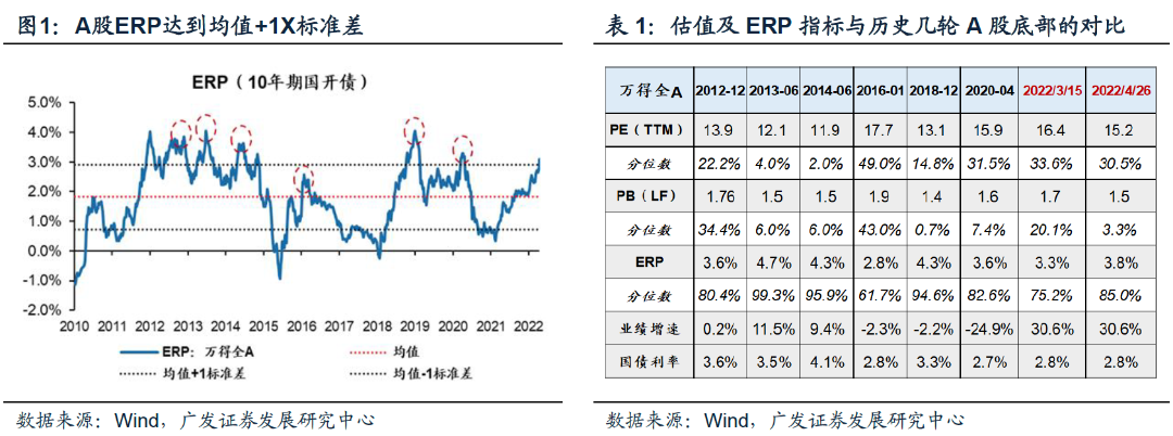经过4月份的进一步下跌,市场的估值/ERP进一步修正,ERP接近顶部区域。4月估值和股权风险溢价较3月中旬继续修正(见下表1)——本轮4月26日指数低点,全部A股PE(TTM)所处的2010年以来历史分位数(下同)为30%、接近均值-1X标准差(18年底时分位数15%,20年3月疫情时分位数32%),A股ERP所处的历史分位数是85%、超过均值+1X标准差(18年底时ERP分位数95%、20年3月分位数82%,位置均超过均值+1X标准差)。