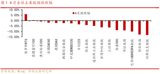 4月全球股指波动加大,主要市场指数下跌。具体看,美股方面,纳斯达克指数、标普500、道琼斯工业指数当月分别下跌13.26%、8.8%、4.91%;A股延续走弱,创业板指、深证成指、上证指数当月分别下跌12.8%、9.05%、6.31%;港股方面,恒生指数当月下跌4.13%。