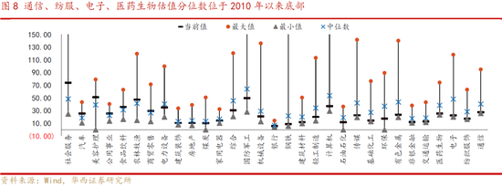截至4月29日,万得全A(除金融、石油石化)PE_TTM为24倍,位于2010年以来25%分位。从行业估值看,31个申万一级行业中,14个行业市盈率位于2010年以来10%分位以下,其中通信、纺织服饰、电子、医药生物市盈率位于2010年以来0.1%、0.1%、0.1%和1.4%分位。