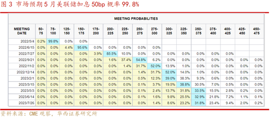 美国经济仍有韧性,美联储仍将维持鹰派货币政策。根据美国商务部初步估计数据显示,美国第一季度GDP折合年率下跌1.4%,低于市场预期的1.1%,净出口和库存对经济的拖累约4个百分点,政府支出萎缩也对经济构成压力,但居民需求和企业投资依然强劲。在高通胀缓解之前,美联储仍将维持鹰派货币政策,5月议息会议大概率将加息50BP并启动缩表,当前市场对美联储加息幅度已计入较多预期,且6月和7月均存在加息50BP的可能性。