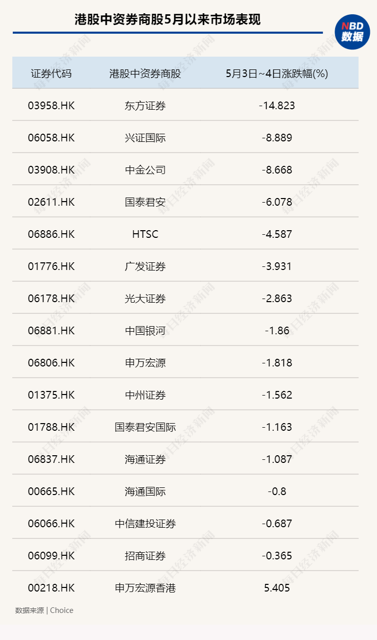 此外,5月3日至5月4日,港股中资券商股普遍走低。据统计,期间东方证券下跌14.8%、中金公司下跌8.67%、国泰君安下跌6.08%、华泰证券下跌4.6%。