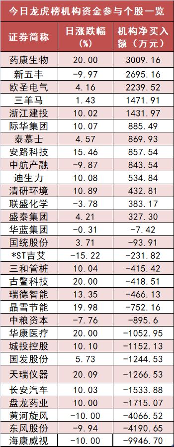 盘后龙虎榜数据显示,机构现身30股,其中药康生物等13股现机构资金净买入,海康威视等17呈现机构资金净卖出。