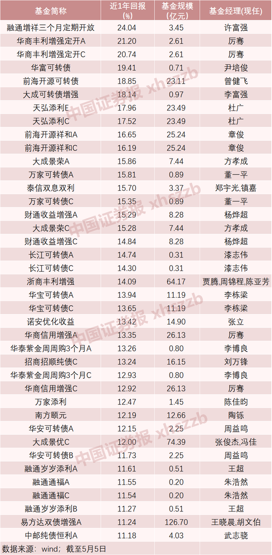 Wind数据显示,截至5月5日,全市场3603只有统计数据的债券基金(不同份额分开统计,下同)中,有3269只在近1年内实现了正收益,占比达90.73%。其中,收益率5%以上(含5%、下同)、8%以上和10%以上的债基数量分别为575只、115只和58只。其中,融通增祥三个月定开债基以高达24.04%的收益率位居第一,华商丰利增强定开A收益率为21.2%,华富可转债收益率为19.41%,前海开源可转债收益率为18.85%,大成可转债增强、天弘添利、前海开源祥和、大成景荣等基金收益率均在15%以上。
