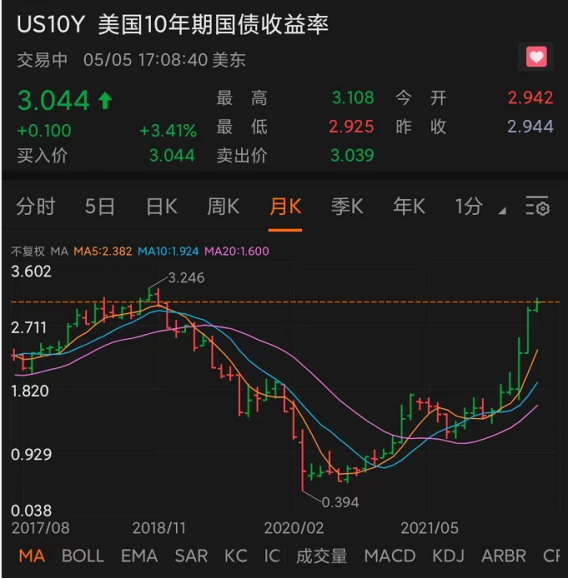 此外,美国10年期国债收益率盘中冲至3.1%上方,创下2018年以来最高值。美元指数亦显著上涨,截至纽约汇市尾盘,衡量美元对六种主要货币的美元指数上涨1.14%至103.7540。有分析指出,尽管短期加息和缩表靴子落地,但美国高通胀压力仍将贯穿全年,史无前例的加息周期还将成为金融市场波动的来源,美债利率还将在实际利率的推动下继续上行。