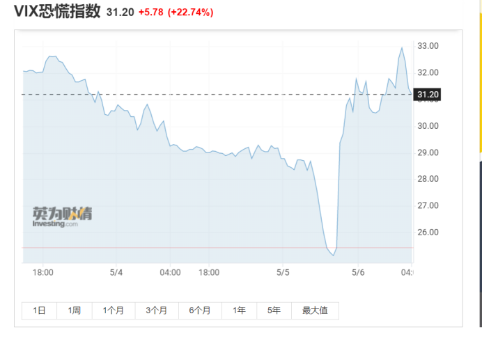 5日当天,全球恐慌指数(VIX)在此前一天大幅下跌后再度急速抬头,截至发稿涨幅超过20%。该指数由芝加哥期权期货交易所于1993年推出,是衡量市场风险和投资者恐慌度的指标指数。国内五一假期期间,全球恐慌指数一度暴涨至36.64点阶段性高点。