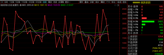 今天市场缩量较为严重,两市成交量跌破8000亿,较昨天缩量1400多亿,上涨个股1254多家,涨停105家,跌停有20多家,又有几只st股20cm跌停,另外跌幅超5%个股也有200多家。