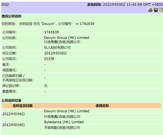 记者今日查询香港公司注册处综合资讯系统发现,字节跳动日前悄然将2012年注册于香港的字节跳动(香港)有限公司更名为抖音集团(香港)有限公司。
