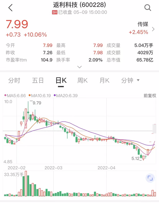 返利科技今日再次涨停,连收4个涨停板,报7.99元,成交金额4029万元,换手率2.09%,最新市值为66亿元,若自4月27日盘中低点5.12元以来涨幅来算,短短6个交易日,累计涨幅高达56.05%。
