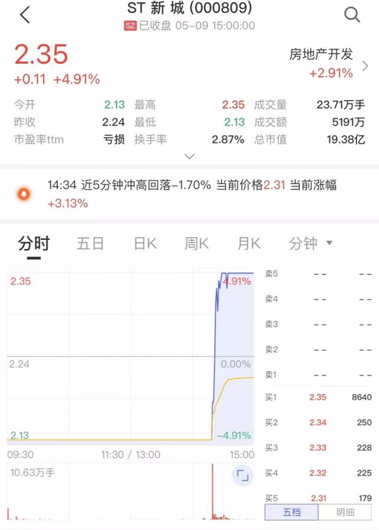 ST新城上演“地天板”行情。9日,ST新城继续以跌停开盘,午后股价异动,从跌停拉升至涨停,成交额5191万元,换手率2.87%。