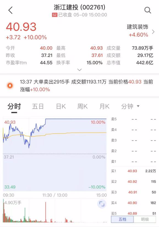 9日,浙江建投再次封板,走出7连板行情,成交额超29亿元,目前价格为40.93元,股价逼近历史新高41.44元。