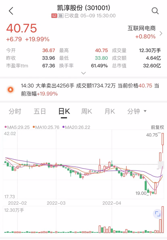 创业板凯淳股份午后拉升涨停,创下4连板,现价40.75元,涨19.99%,成交额4.64亿元,换手率61.49%,最新市值达33亿元。若以4月27日盘中低点19元以来涨幅来算,近6个交易日,该股便实现了翻倍,累计涨幅高达114.47%。