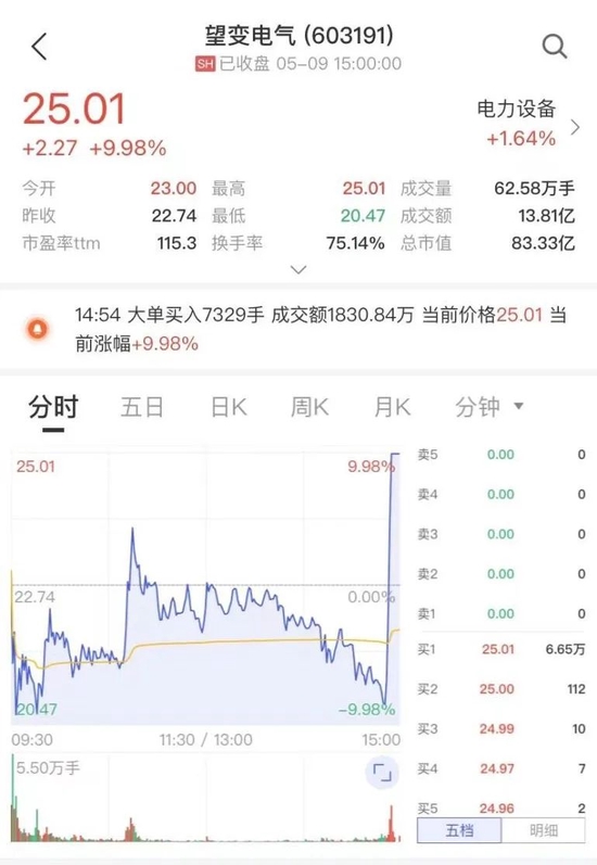 望变电气尾盘集合竞价前完成“地天板”,收获上市以来连续第五个涨停,成交额达13.81亿元,换手率高达75.14%,总市值83亿元。