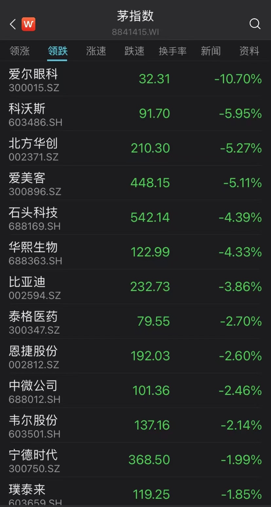 9日,“茅指数”“宁组合”走低,其中1752亿元市值的爱尔眼科跌超10%,科沃斯、北方华创、爱美客跌超5%,华熙生物跌超4%,比亚迪、招商银行、东方雨虹、美的集团、立讯精密跌超3%,泸州老窖、贵州茅台、中国中免、韦尔股份跌超2%,宁德时代跌超1%。