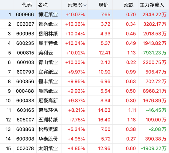 造纸板块大涨,板块指数大涨逾6.7%,晨鸣纸业、岳阳林纸、青山纸业涨停,龙利得20cm涨停。