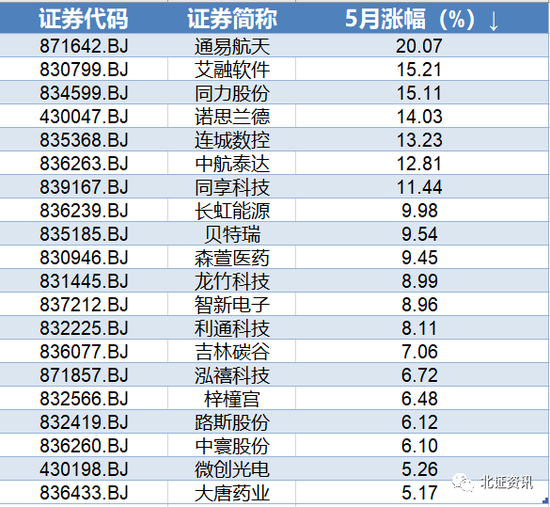 事实上,5月份以来,北交所股票一改以往低迷状态,多数股票呈现小幅上涨的情况。20只股票5月以来累计涨幅超过5%,其中7只累计涨幅超过10%。通天航易以20.07%的涨幅居于北交所强势股榜首;艾融软件、同力股份的累计涨幅均超过15%,此外,累计涨幅超过10%的股票还有诺思兰德、连城数控、中航泰达和同享科技。北交所头部公司、明星公司也涨幅明显,长虹能源5月以来涨幅为9.98%,贝特瑞和森萱医药分别为9.54%和9.45%。龙竹科技、智新电子、吉林碳谷等的涨幅也均超过7%。
