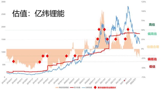 看亿纬锂能这个案例,当中红色这条线就是我们的动态估值,能够发现随着业务增长,它的估值是不断上升的,就是成长股的典型特点,价值不断上升。另外我们发现在2018年底的时候,它的股价低于内在价值,低估的程度可能是百分之三四十。最终亿纬锂能享受了戴维斯双击:内在价值不断提升,从低估变成高估。