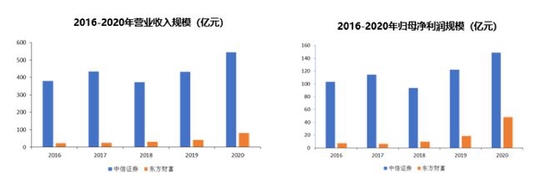 从收入和利润规模来看,东方财富显然和中信证券不在一个量级。2020年中信证券营业收入为544亿元,归母净利润149亿元;东方财富营业收入为82亿元,归母净利润48亿元。东方财富的收入跟中信证券比起来差远了,利润也同样如此。那么为什么东方财富市值超过了中信证券呢?