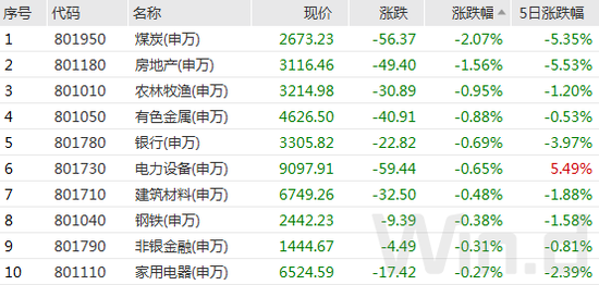 从下跌板块来看,煤炭、房地产、农林牧渔、有色金属等板块跌幅居前。