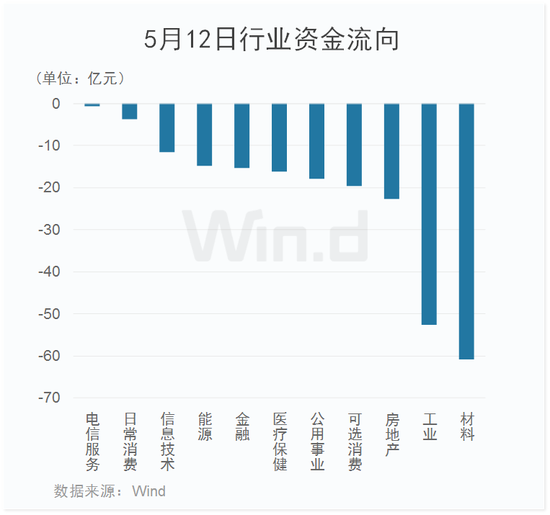从5月12日行业资金流向来看,主力资金净流出200多亿元,所有行业均净流出,其中材料板块净流出额超60亿元,位居首位;工业板块紧随其后,净流出额超50亿元;房地产、可选消费、公用事业等板块净流出额亦较高。