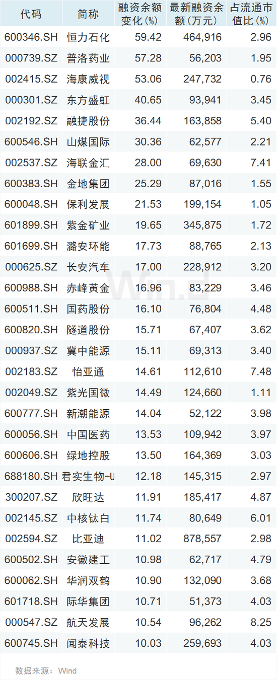 在两融余额回升的同时,部分公司融资余额亦快速增加。Wind统计显示,5月以来,有30只个股融资余额增长超过10%、最新融资余额超5亿元。具体来看,恒力石化融资余额增幅达59.42%,位居第一;此外,普洛药业、海康威视、东方盛虹、融捷股份、山煤国际、海联金汇、金地集团、保利发展等公司融资余额增幅均超过20%。从两融资金大幅加仓个股来看,多为前期超跌个股。
