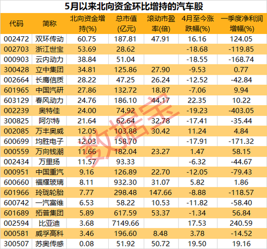 证券时报·数据宝统计5月以来北向资金环比增持的汽车股名单,共计21股。其中,外资对于双环传动和浙江世宝的增持力度居前,幅度均在50%以上;另有云内动力、立中集团等11股增持幅度逾10%。