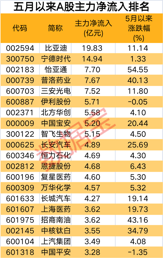 五月以来多只汽车股获得资金注入。比亚迪主力净流入19.83亿元;长安汽车、长城汽车、上汽集团均获3亿元以上净流入;供应链上,宁德时代净流入额也高达14.94亿元。部分医药、有色股也获得主力青睐。资金加码之下,个股市场普遍表现良好,涨幅最高的为两只交运股——怡亚通与招商南油,期间涨幅依次为54.55%、43.16%;汽车股涨幅也都不错,长安汽车累计上涨25.69%。