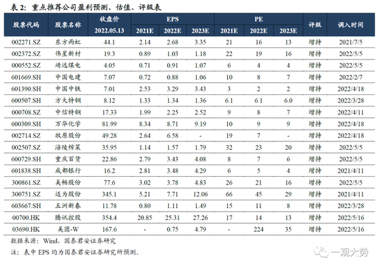 重视一:反弹提供极佳的时间和空间做风格切换。股票价格下跌的过程中,投资者往往会忧虑“割在地板上”而不愿意做风格切换。4月份的社融由于各地疫情封控导致预测方差极大,因此高或低于预期均没有参考价值,但是我们仍能通过M1M2剪刀差的扩大反映出居民与企业的信贷需求并非来自于资本开支的预期而是应对不时之需。中长期贷款需求的承载路径以及强度的模糊仍然是当前股票市场还不能够顺畅交易趋势性反转的核心原因。加之新的周期性因素的变化开始出现,WTO贸易晴雨表前瞻数据显示包括电子元件在内的全球贸易活动开始放缓;俄乌局势也使得地缘政治风险下“安全”优先级提升。因此,对于国内股票投资而言,需求恢复的必要性和能见度要远胜于供应链的修正。前期估值压缩剧烈的成长板块已经率先反弹,我们建议在反弹的中后期,要把握市场反弹的极佳窗口期做切换增仓价值板块,与稳增长相关的周期和消费在未来一个阶段有更好的需求修复前景与业绩预期的稳定性。