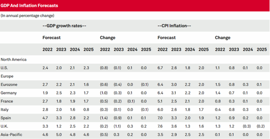 标普全球首席经济学家Paul Gruenwald表示:“现在预计美国经济增速将下降80个基点至2.4%,欧元区将下降60个基点至2.7%,2023—2025年的预测变化相对较小,自我们上次预测以来,与基线预测相比的风险状况已经恶化,为明显的下行风险”。