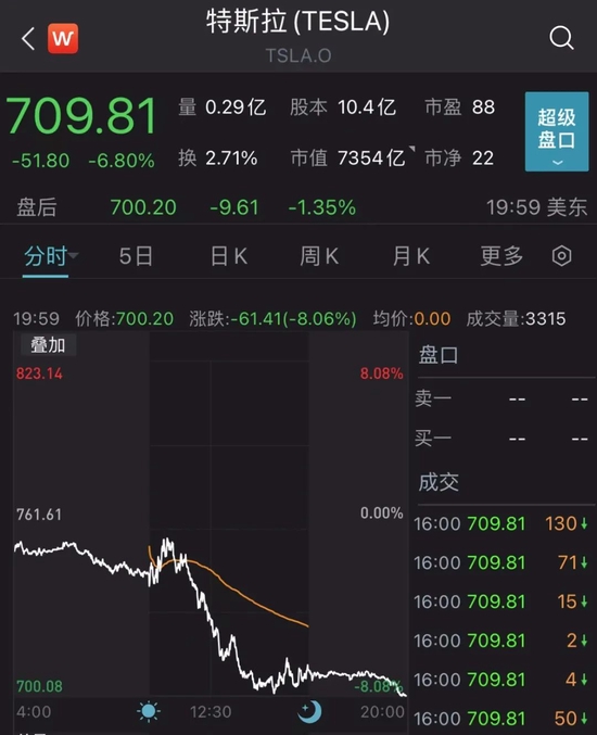 消息一出,特斯拉股价大幅走低,最低下跌近8%,收盘跌6.8%。4月5日以来,特斯拉股价已持续回撤,累计跌幅约为38.03%,最新收盘价为709.81美元,为2021年9月以来最低收盘价。股价下跌令特斯拉市值一夜蒸发537亿美元(合约人民币超3600亿元,近两个上汽集团(600104)市值)。