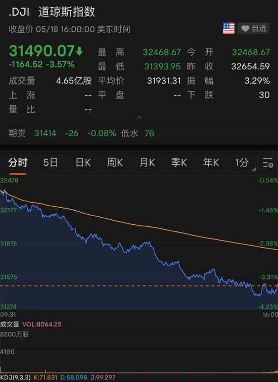 当地时间5月18日,纳指跌4.73%,创5月6日以来最大跌幅;标普500指数跌4.04%,为2020年6月以来最差单日表现;道指跌3.57%,创2020年6月11日以来最大跌幅。