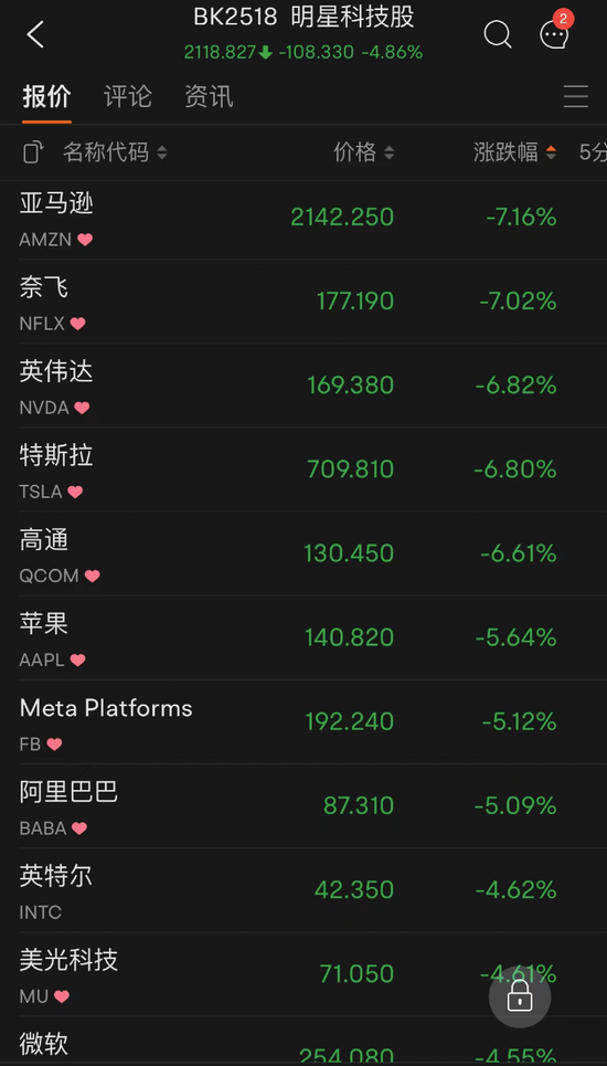 周三,大型科技股也多数大幅收跌。