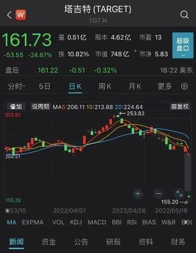 继沃尔玛后,美国第二大零售百货集团塔吉特因业绩大幅不及预期,股价暴跌。18日,塔吉特下跌24.87%。18日美股盘前,塔吉特公布了其远低于市场预期的2022财年一季度财报。报告期内,公司总营收为251.7亿美元,同比略增4%;净利润10.09亿美元,同比大幅下滑51.9%。