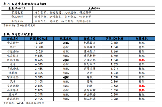行业配置的主要思路:展望5月,我们认为政策底显现后风险偏好正持续改善,市场进入积极可为阶段。前期影响风险偏好的国内外因素,如国内疫情、海外美联储加息以及俄乌局势均出现好转迹象,后续市场将迎来超跌反弹,催化因素主要有三方面,一是随着年初以来市场的三轮下跌,各指数逐步进入价值区间,各大指数的估值分位均已处于较为便宜的位置,便宜是硬道理。二是国内点状疫情逐步缓解是大势所趋,等有效控制住疫情之后,坚持经济建设为中心,努力实现全年经济社会发展预期目标,保持经济运行在合理区间,中国依然是今年全球范围内增速较快的经济体。三是随着4月政治局会议一锤定音,基调暖意明显,并且随着业绩空窗期的到来,影响市场风险偏好的负面因素将得到缓释,市场将迎来修复,进入可为阶段。结构上看好消费以及成长类的超跌反弹。从中期来看,磨底阶段消费占优,关注两个细分领域,一是调整比较充分且受益于疫情边际好转的食品饮料、餐饮旅游、酒店、汽车、家电等行业;二是估值处于低位的医药生物等。另一方面,政策定调偏暖,成长类风格经过前期大幅下跌后配置价值显现,关注超跌反弹机会,细分领域关注互联网、新能源、国防军工、TMT等。5月首选行业家用电器、食品饮料、医药生物。