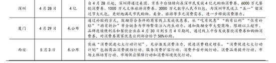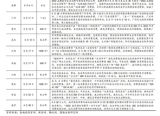 全面促进消费是我国扩大内需的主要抓手之一,多数地方政府通过发消费券和减税减费等形势激活消费潜力,财政支持将至少持续至今年Q3。今年以来在点状疫情不断的扰动下国内消费恢复持续受阻,4月25日国务院印发《关于进一步释放消费潜力促进消费持续恢复的意见》,提出了五方面二十项重点举措,以短期支持和中长期促进相兼顾,综合施策释放消费潜力,促进消费持续恢复。具体从地方举措来看,多数地区已通过实施发放消费券以及为中小企业减税降费的直接与间接相结合的补贴形势,激活本地消费潜力。具体来看各地直接撬动消费的消费券发放情况,今年前4个月,浙江、江西、四川等多地先后发放总额超过34亿元的消费券,包括米面粮油等必选消费,以及家电、汽车、酒店旅游等可选消费,有效提振消费需求,根据我们对当前各省市发放消费券进度的梳理来看,部分地区已开始发放第二轮消费券,如江西省、广州市、绍兴市等地,此外,部分地区也已提出消费补贴支持将持续至Q3,如北京市、福州市、南京市等。