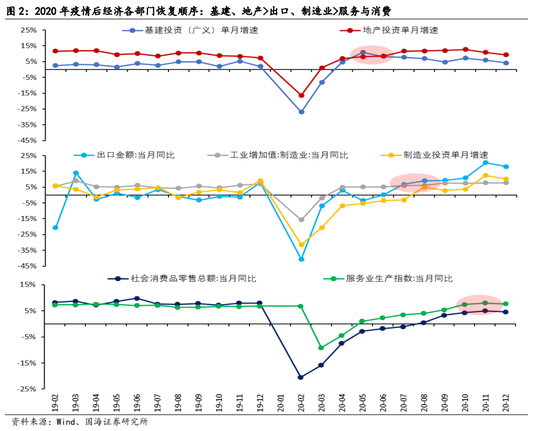 1、2020年疫后经济各部门的修复,遵循着先基建与地产、后出口与制造业,消费与服务最后低位企稳的过程。财政、货币政策双宽等逆周期调节的发力是2020年Q2基建与地产驱动经济实现V型反转的关键,海外供需缺口的放大叠加国内复工复产的优势决定了出口-制造业链条从2020年Q3接力成为经济复苏的主引擎。而受制于疫情对消费场景和居民收入预期的双重抑制,消费与服务业在疫后恢复相对滞缓。