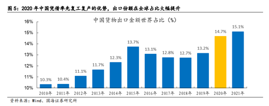 2020年疫情后逆周期调节政策加码发力,基建与地产投资率先回升,随后海外供需缺口的扩大助力出口-制造业链条景气上行,而受疫情影响较重的消费与服务部门恢复滞缓。2020年疫情全面爆发后我国稳增长政策多力并举,基建、地产投资等逆周期调节工具再度发力托底经济。在此背景下,疫情前趋势向好的基建与地产部门快速修复,并于2020年二季度率先回升至2019年水平。随后,伴随以美国无限量QE为代表的海外大规模经济刺激政策的出台,海外需求逐步回升,但由于生产供应受限,全球供需错配问题日益趋严。在此阶段,中国凭借率先复工复产的优势,出口份额在全球占比大幅提升。2020年三季度,国内出口-制造业部门景气度高增,并超越2019年同期水平,成为疫情后复苏的第二个部门。最后,在疫情散点式反复的影响下,受疫情冲击最大的消费与服务部门恢复较为滞缓,直至四季度才趋近于疫情前水平。整体而言,2020年疫情后经济各部门恢复顺序为:基建、地产>出口、制造业>服务与消费,总量性逆周期调控政策直接发力的地产与基建部门率先恢复,在逆周期变量改善带动经济企稳后,制造业投资、服务与消费等顺周期经济部门逐步跟随改善,期间海外供需缺口的持续扩张助推了出口链条景气度的快速上行。