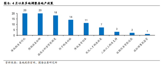 地产政策方面,5月起国务院牵头部署稳地产政策,目前已经形成中央领导、金融部门、住建部门、地方政府积极落实的四方稳地产格局,主要政策抓手为调整房贷利率、限售限贷政策。全国层面来看,自去年下半年地产进入下行区间以来,稳地产措施的主要实施主体在于金融部门、住建部门和地方政府。随着4月经济数据表明当前宏观经济运行受到疫情严重冲击,以及地产由上年部分民营房企违约的结构性问题向系统性问题转变,5月起国务院牵头部署稳地产政策,已出台举措包括5月15日部署调整差别化住房信贷政策、5月18日李克强总理云南考察明确表态稳地价稳房价以及5月20日下调5年期LPR。地方层面来看,在政治局会议强调支持各地从当地实际出发完善房地产政策背景下,5月以来超过45个城市就地方性地产政策进行调整。从城市来看,5月以来松绑调控政策上二线城市跟进最为积极,土拍市场热度低、流拍率高,经济增长对房地产依存度更高的沈阳、兰州等北部二线城市出台政策更加快速;从内容来看,政策的侧重点主要落在调整首付比例、限购、限贷上,其中降低购房首付比例的城市最多,达到11个,且主要集中在江苏和广东两省。整体来看,当前中央出手稳定产仍处于初期阶段,叠加地产受疫情冲击下行压力仍然较大,预计后续由高层牵头部署政策会相继落地。