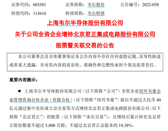 今日,韦尔股份公告称,全资子公司绍兴韦豪拟以不超过人民币40亿元通过集中竞价或大宗交易等方式增持北京君正的股票,最大增持数量不超过5,000万股,增持股票比例不超过10.38%。