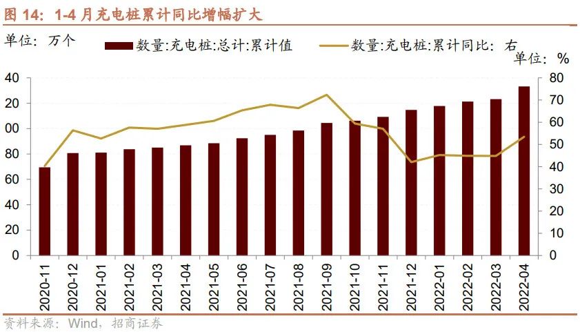 1-4月充电桩累计同比增幅扩大。1-4月充电桩累计数量达到133.22万个,累计同比增加53.44%,增幅较前值扩大8.62个百分点,相比2020年同期增长143.65%。