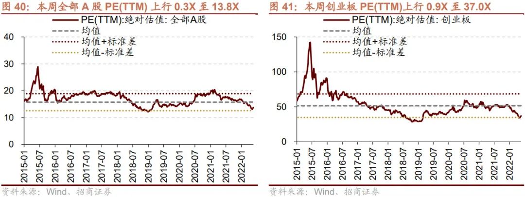 本周全部A股估值水平上行。截至5月20日收盘,全部A股PE(TTM)上行0.3X至13.8X,处于历史估值水平的30.3%分位数。创业板本周上行,PE(TTM)上行0.9X至37.0X,处于历史估值水平的15.0%分位数。代表大盘股的沪深300指数PE(TTM)本周上行0.2X至11.3X,处于历史估值水平的35.0%分位数。代表中小盘股的中证500指数PE(TTM)本周上行0.3至15.3X,处于历史估值水平的0.9%分位数。