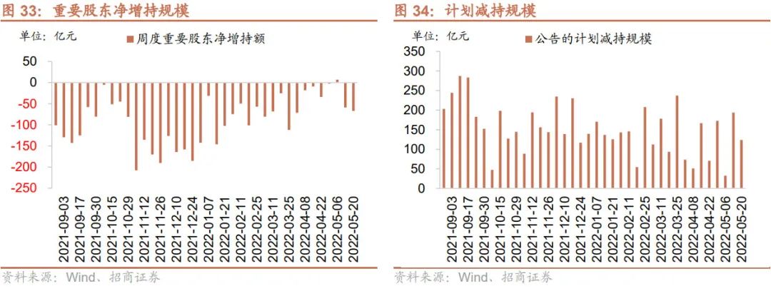 从资金需求来看,重要股东净减持规模扩大,计划减持规模下降。本周重要股东二级市场增持9.4亿元,减持76.4亿元,净减持67.0亿元,净减持规模扩大。其中,净增持规模较高的行业包括医药生物、建筑装饰、纺织服装等;净减持规模较高的行业包括化工、房地产、电气设备等。本周公告的计划减持规模为123.8亿元,较前期下降。