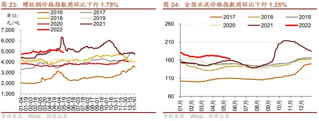 【中观·景气】4月份智能手机产量当月同比转负,集成电路产量同比降幅扩大,工业机器人产量当月同比由正转负;1-4月份房屋竣工面积、商品房销售额、商品房销售面积、房屋新开工面积、开发资金来源累计值同比降幅均扩大,房地产开发投资完成额累计同比转负。1-4月我国发电量累计同比增幅收窄,4月我国用电量累计同比转负。本周钢坯、螺纹钢价格继续下行,铁矿石价格指数上行。全国及多地区水泥价格指数均下行。