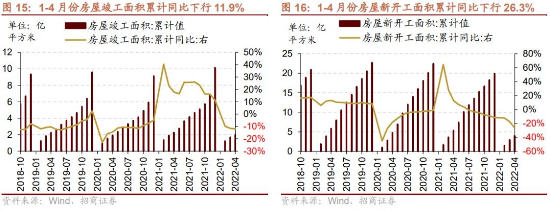 1-4月份房屋竣工面积、商品房销售额、商品房销售面积、房屋新开工面积、开发资金来源累计值同比降幅均扩大,房地产开发投资完成额累计同比转负。1-4月份房屋竣工面积累计值为2.00亿平方米,累计同比下行11.90%,较前值降幅扩大0.4个百分点;1-4月份房屋新开工面积累计值为3.97亿平方米,累计同比下行26.3%,较1-3月份降幅扩大8.8个百分点。