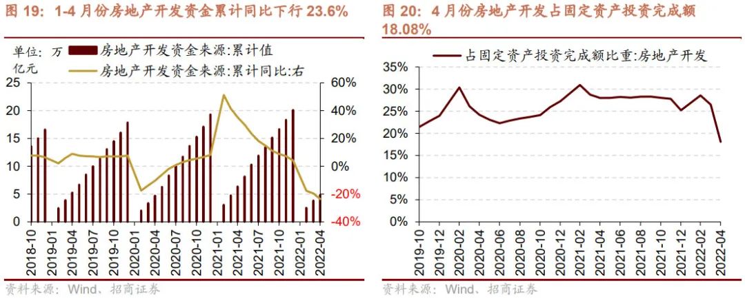 4月份房地产开发占固定资产投资完成额的比重为18.08%,1-4月份房地产开发资金来源合计累计值为4.85万亿元,累计同比下行23.60%,降幅较前值扩大4个百分点。