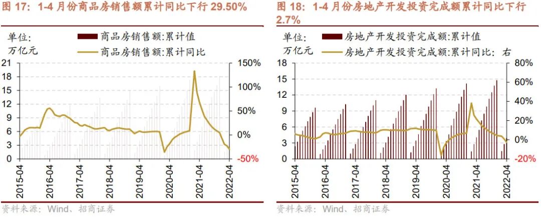 1-4月份商品房销售额累计值为3.78万亿元,累计同比下行29.50%,降幅扩大6.8个百分点;1-4月份商品房销售面积累计值为3.98亿平方米,累计同比下行20.9%,降幅扩大7.1个百分点;1-4月份房地产开发投资完成额累计值为3.92万亿元,累计同比下行2.7%,增速由正转负。