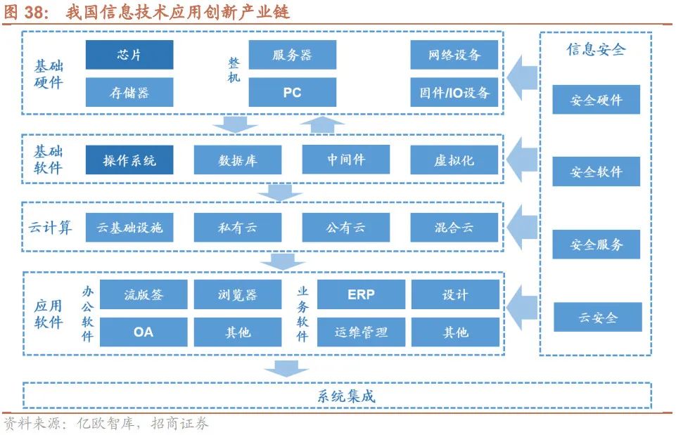 CPU和操作系统居于信创生态核心地位。信创产业以信息技术产品生态体系为基础框架。当前传统的信息技术产业主要由四部分组成:基础设施、基础软件、应用软件以及网络安全。随着新一代信息技术创新发展,云服务、系统集成方也成为信息技术产业的重要组成部分。