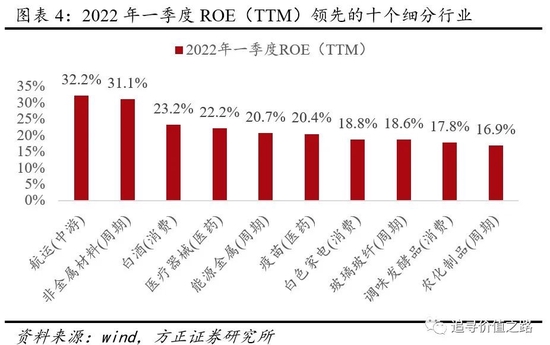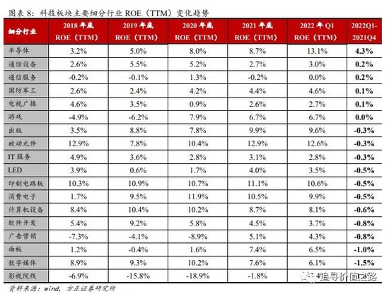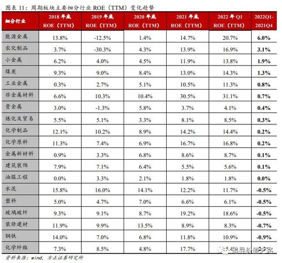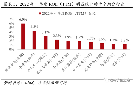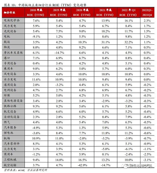 从ROE变化趋势看,2022年一季度ROE(TTM)较2021年四季度ROE(TTM)提升明显的行业主要分布在周期和中游板块,科技和医药板块也有部分细分行业盈利改善明显。